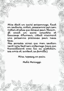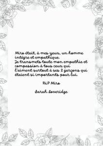 Si tu voyais ta soeur, Miro, mais en fait je suis sûre que tu la vois. Et bien tu sais alors qu’elle est extraordinaire de courage, de dignité et de générosité. Un cœur énorme comme le tien. Je pleure pour elle, pour tes fils, ta maman, tous tes proches. Ton Ivana chérie, ma « mémoche » chérie, elle est épatante. Tu peux être fier de ta famille Miro. Ils veillent sur toi comme tu veilles sur eux. Rien ne sera plus pareil mais tu seras toujours là, vivant dans nos cœurs. -