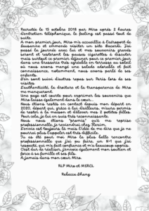 Miro, mon pote, mon frère, je ferme les yeux et je revis ces moments que nous avons partagés à Hong Kong, Lausanne, Genève, Barcelona, en Andorra, en Haute-Savoie, à la Tcho…
