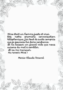 Miro, tu me manques. Nos appels quasi quotidiens, nos disgressions sur tous les sujets, notre bienveillance mutuelle, notre amour pour nos familles respectives.