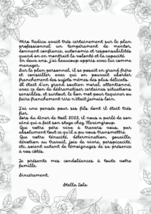 nous nous connaissions finalement assez peu, nous nous sommes rencontrés deux fois, à l’occasion de la confirmation et des 18 ans de Nella, mais j’ai pu apprécier très rapidement à toute sa valeur ton immense amour pour ta famille et tes fils Mathys et Maxence, ta bienveillance, ta générosité, ton humour, ton côté « fou fou » et ton sens inné de la générosité.